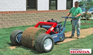 The NEW Brouwer RollMate 2448 Sod Installer is the largest of the Brouwer installers and can install up to 48 in. wide big rolls. The 48” wide, 4 foot 48” diameter, 2000 pound roll capacity along with the exceptional maneuverability, make the RM 2448 an ideal choice for most sod laying applications. A reliable Honda 11.0 HP Industrial/ Commercial engine drives through a field-proven infinitely variable hydrostatic drive to hydraulic motors in front wheels and shifts effortlessly from forward to reverse with a single lever control mounted on the steering handle. The sod roll can be lifted by inserting the adjustable mandrel in the sod roll and mounting it onto the lift arms. The Brouwer RollMate Sod Installer is an outstanding machine for operating on slopes, highly maneuverable and easy to operate.